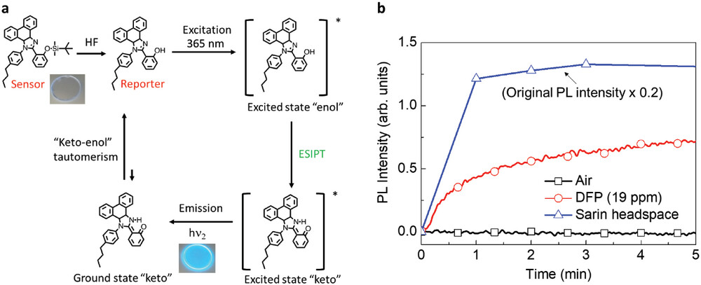 Rapid and reliable in-field identification of nerve agents is crucial for the protection of defence personnel and first responders. A fluorescence-based method is introduced that differentiates between V-series and G-series nerve agents, avoiding false positives from common acids by using two distinct detection mechanisms: photoinduced hole transfer for V-series detection and a turn-on mechanism triggered by hydrogen fluoride for G-series detection.