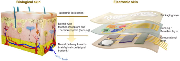 Electronic skin (e-skin) integrates advanced sensors to detect stimuli and is vital in areas like healthcare, robotics, and wearables, with low-cost fabrication being key. This review explores innovations in printing high-quality electronic layers using inorganic nanostructures and highlights the challenges and solutions for scalable, high-resolution printing.