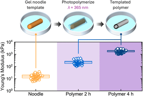 This work presents a new approach to spatially control polymerisation by localising benzophenone-based photoinitiators within self-assembled dipeptide gel noodles, ultimately enabling the formation of complex polymeric structures.